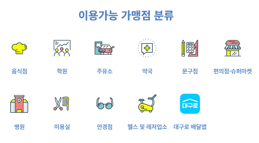 온라인 업종, 대형마트, 유흥업소, 백화점, 면세점, 귀금속 판매점 등은 사용이 제한됩니다.